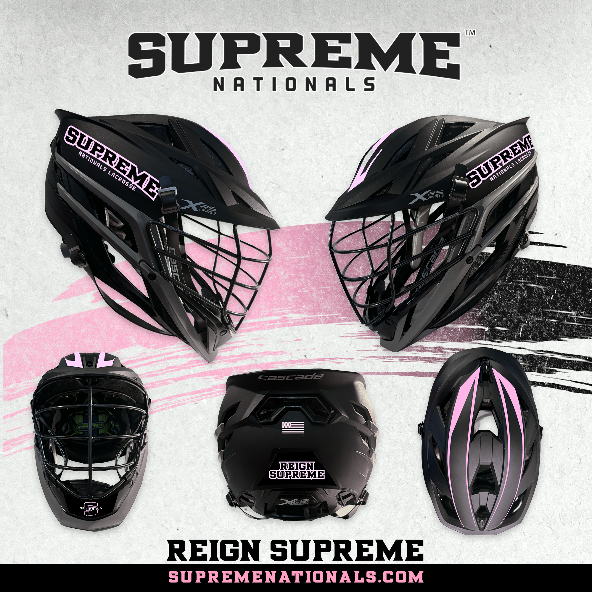 This amazing new helmet was designed by the Madlax artists and graphic designers was made exclusively for Supreme by the national helmet leader in the industry - CASCADE! It features and INCLUDES decals with a new Supreme logo on both sides, a back REIGN SUPREME Slogan on the back, an official S Nationals logo on the chin and USA Pink Flag!